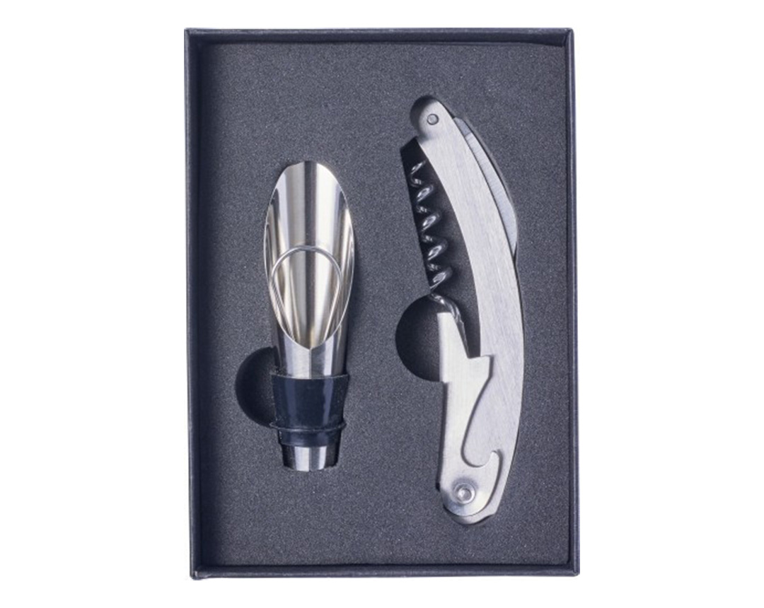2-teiliges Sommelierset ‚Rioja‘ aus Edelstahl, bestehend aus einem Kellnermesser und einem Verschluss mit Ausgießer.